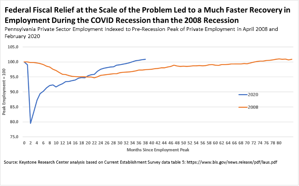 “Pennsylvania’s private sector job market has now fully recovered from the pandemic. As the chart below shows, private sector employment rebounded to more than its pre-pandemic level in less than three years (34 months) – thanks to fiscal policy at the scale of the COVID downturn. This was less than half the 73 months it took for private sector jobs to fully rebound after the Great Recession. That recovery was slower because Congress insisted on austerity policies – cutting spending – after the 2010 elections.