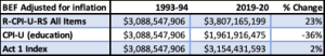 All inflation adjustments adjust 2019-20 funding amounts to 1993 dollars by using one of three measures of inflation between 1993 and 2019.