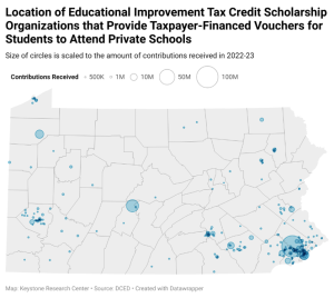Just 24 of the most exclusive – and most expensive (average tuition of $41,497) – Pennsylvania private schools received at least $16.7 million in EITC and OSTC tax credits in 2022-23. The Episcopal Academy in Newton Square alone received nearly $5 million. We know nothing about the socio-economic characteristics of the Academy’s voucher students, whether scholarships are reaching low-income kids, or if the program is impacting the income and racial/ethnic diversity of the school.
