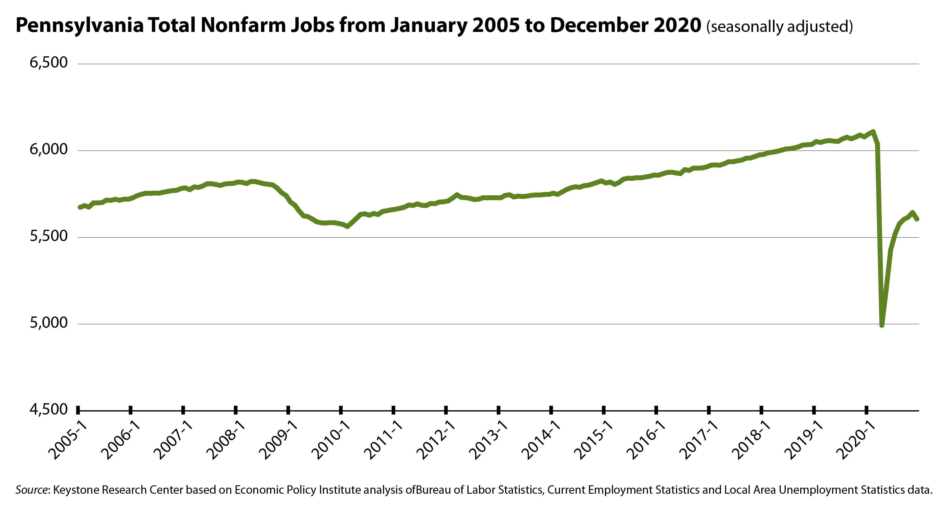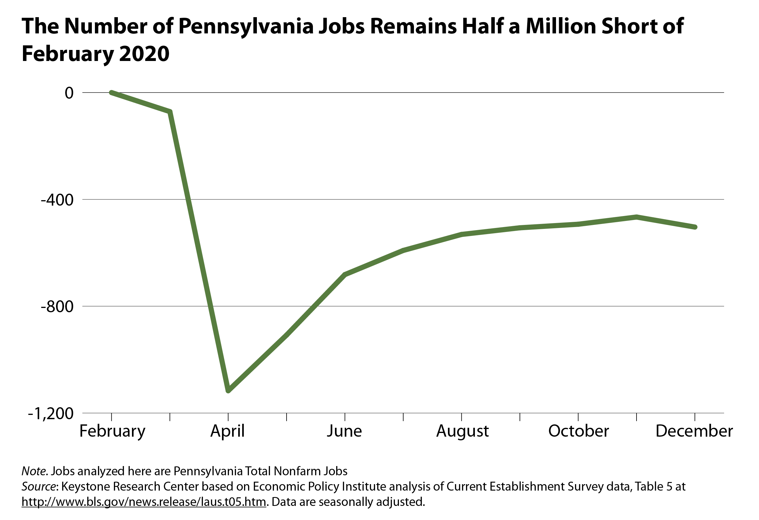 To avoid the definitional complexities associated with the unemployment rate—and with alternate, more inclusive measures of unemployment—the simplest approach is to look at the number of jobs on the payrolls of Pennsylvania employers. As the next chart shows, from February to April, the state lost over 1.1 million jobs. While Pennsylvania regained a lot of jobs from April to August, job growth has stalled since then, in part because the resurgence of the coronavirus makes businesses reluctant to reopen and workers reluctant to return to work. In December 2020 (the latest state-level data available), we still had half a million fewer jobs than in February of 2020.