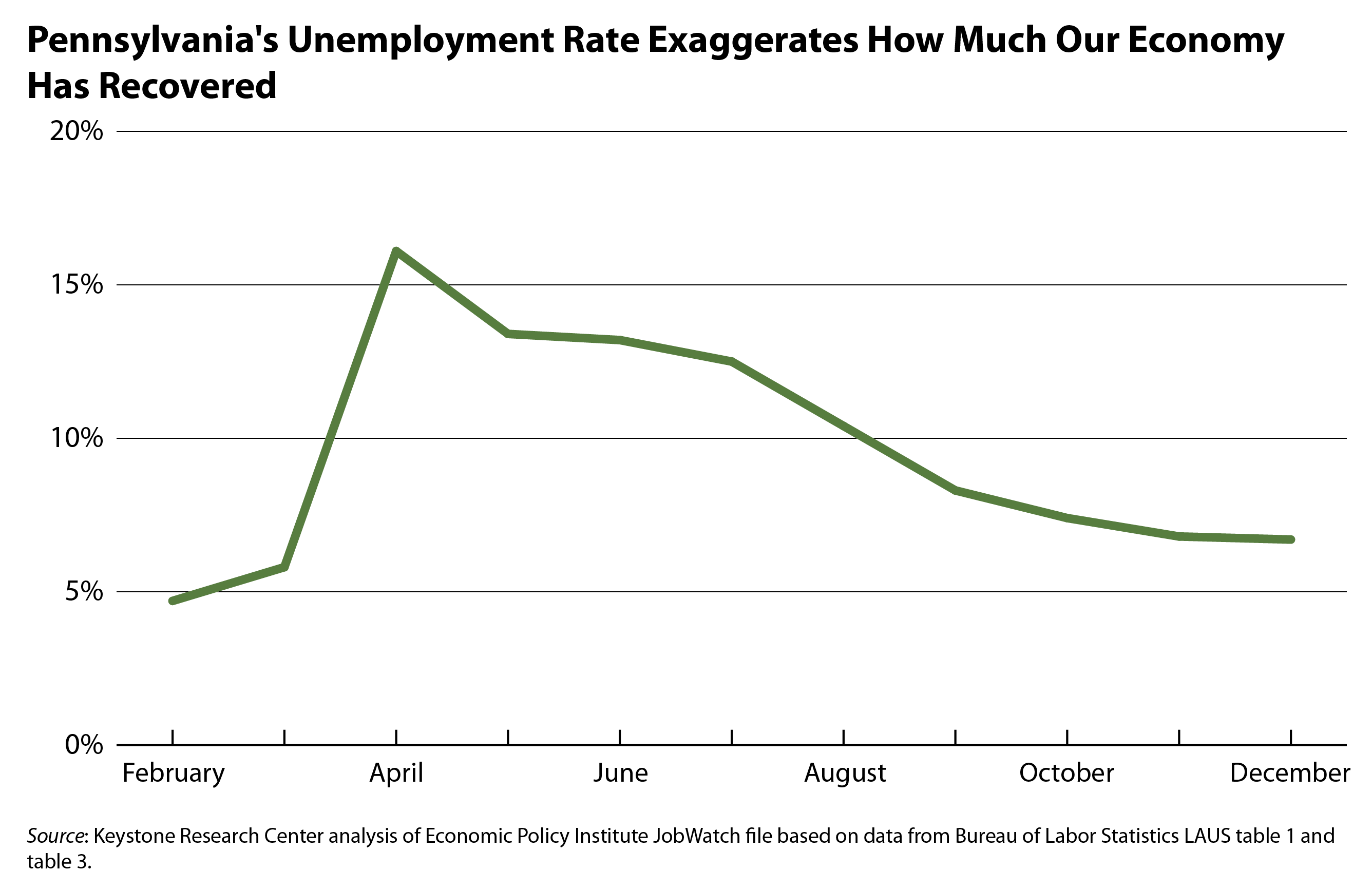 One commonly cited measure of economic health is the unemployment rate. Today, in 49 states, the unemployment rate remains higher than in February of 2020. In Pennsylvania, the unemployment rate spiked at 16% in April 2020 and has since dropped to 6.7%, compared to 4.6% in February. These figures make it seem like Pennsylvania’s economy has largely rebounded from the steep plunge in March and April 2020. That impression is misleading, however, because the unemployment rate underestimates joblessness. The reason: many workers who lose jobs are not counted as unemployed because they are not looking for work—understandably so given that looking for work in the pandemic requires risking your health.