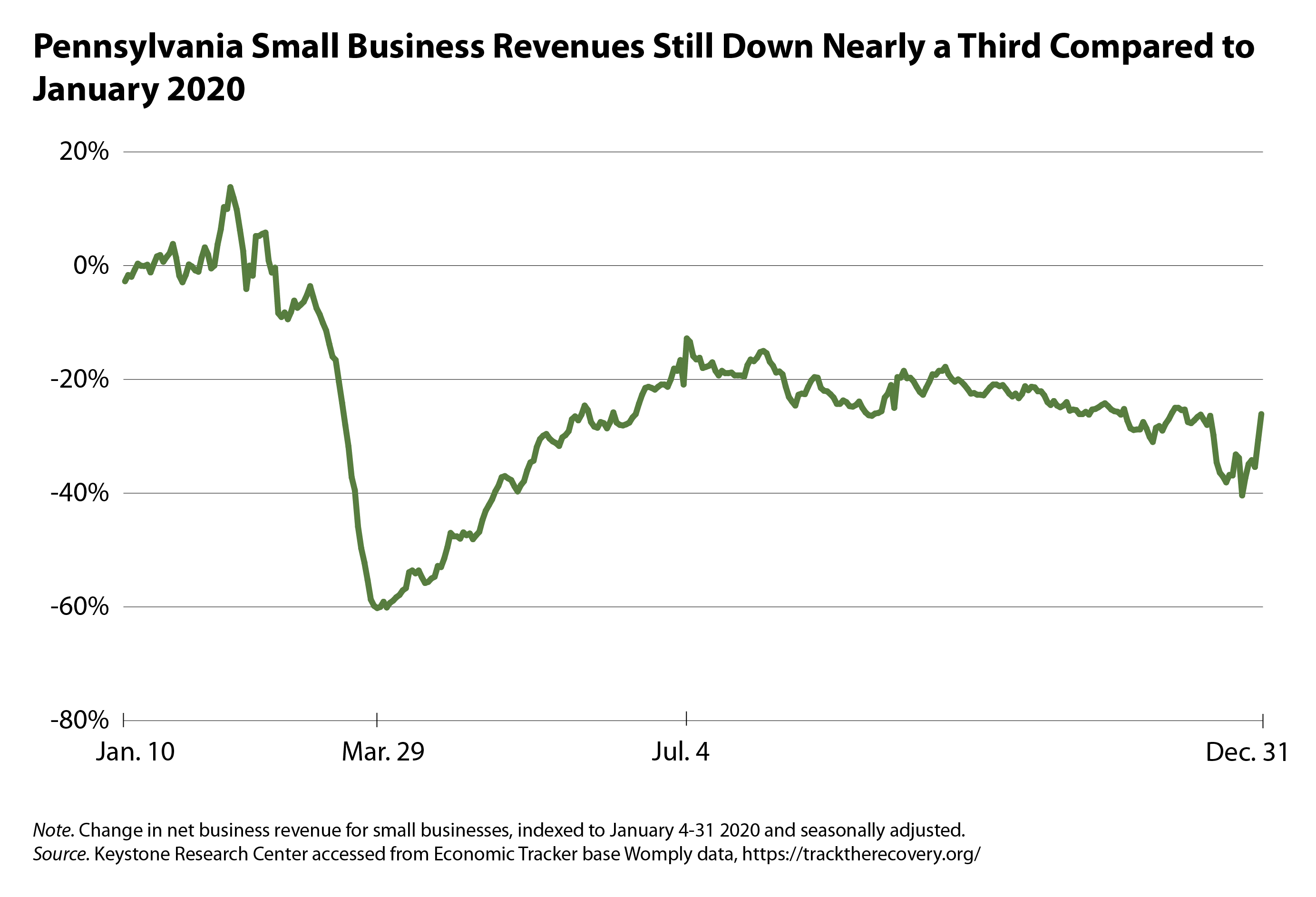 Economists use multiple measures to assess the health of Pennsylvania’s economy. Special care is needed to identify reliable measures when the economy is in a downturn, including the true devastation caused by the current pandemic. This blog presents trends for two revealing short-term measures of economic health for workers and for small businesses: jobs and small-business revenues. Our findings: our economy remains in a deep hole, having recovered only about half the ground lost by these measures pre-COVID to April 2020. Small business revenues remain over 25% below the level of January 2020, a stunning Depression-level collapse. The policy message: federal and state lawmakers must continue to provide robust relief, and then economic stimulus, to reduce the damage experienced by our workers and small businesses.