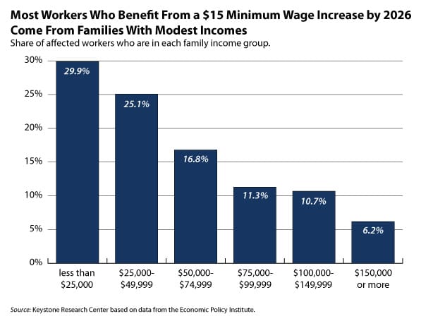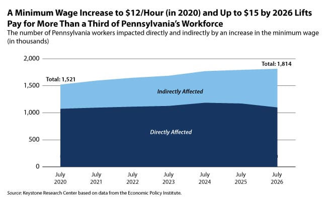 Just over 1.8 million Pennsylvania workers would benefit by 2026, 1.1 million directly because they would otherwise earn less than $15 per hour in 2026, and another 0.7 million indirectly. The second group would earn over $15 per hour already in 2026, but get a bump or “spillover” increase from employers who value them enough to pay them above the new minimum.