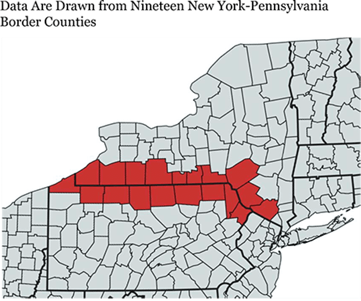 - Employment began going up at the same rate in the two states from 2013 to mid-2018 and then increased much faster in New York! One possible interpretation: with the gap in the minimum wage large by 2018 ($4 or more and still growing), more and more lower-wage Pennsylvania workers in rural border counties are going to New York to get decent jobs. By contrast, fewer and fewer New York border county workers are coming to Pennsylvania to take crap jobs.