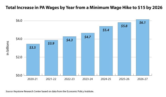 The total annual wage increase injected into the Pennsylvania economy by the governor’s proposal would start at $3.5 billion per year (in 2018 dollars) and rise to $6.1 billion by 2026. That’s less than the $9.5 billion boost the economy would have gotten from last year’s $15 by 2025 proposal—but $6.1 billion is still real money and real consumer demand that Pennsylvania’s working families and businesses, small and large, could really use.