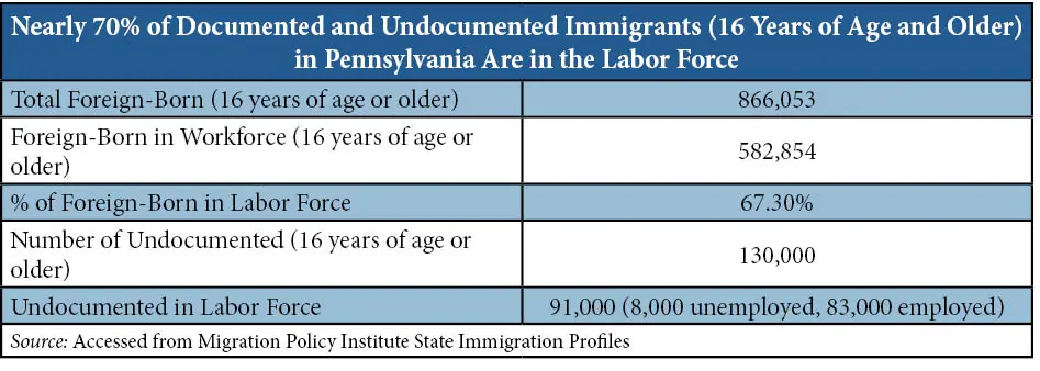 There are 28.3 million foreign-born residents in the labor force, of which 7.5 million are undocumented immigrants. More than 866,000 immigrants aged 16 or older live in Pennsylvania, of which over 582,000—including 91,000 undocumented immigrants—are part of our workforce. Almost 9% of Pennsylvania’s workforce was born abroad, and 1.4% of the workforce is here without documentation.