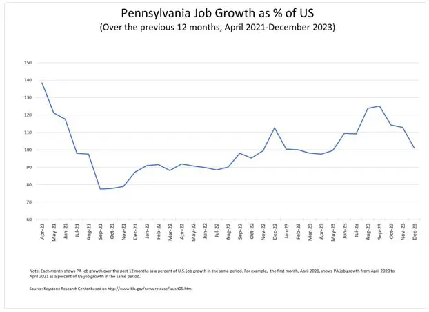 One indicator of the strength of recent Pennsylvania job growth is how it compares with U.S. job growth.