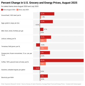 Explore how the prices of groceries and other staple items have changed over the last month and since August 2024. (BLS Average Retail Food and Energy Prices, August 2025)