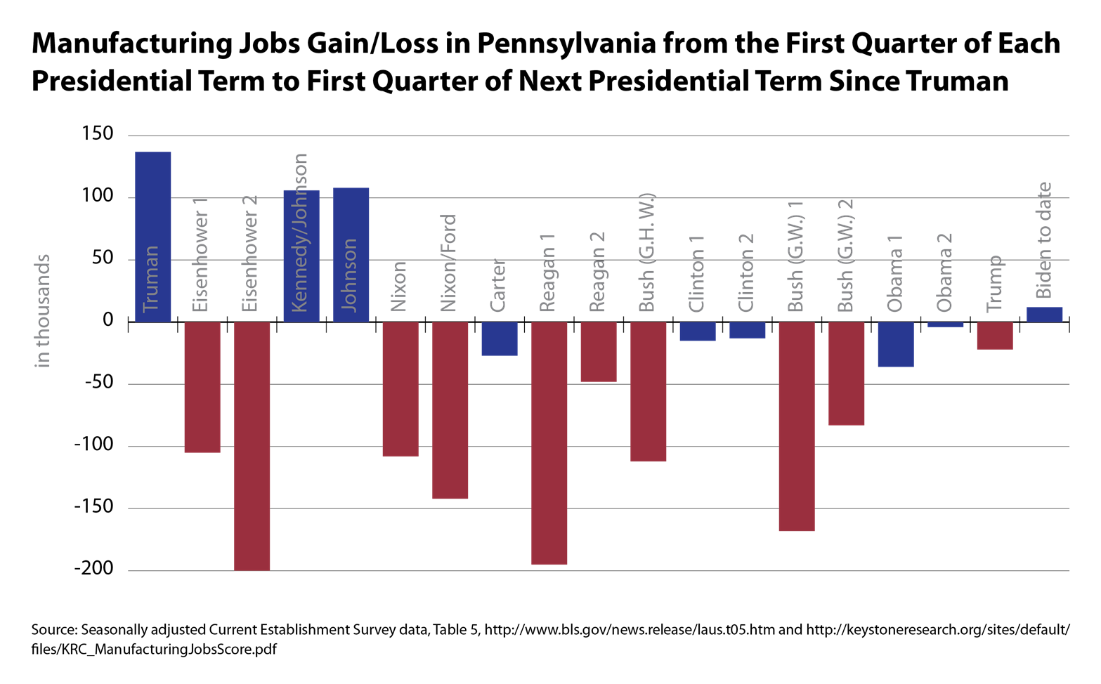 From a historical perspective, the Biden administration could represent a watershed in the nation’s manufacturing policies. While the loss of steel and other manufacturing jobs eviscerated Pittsburgh and other industrial heartland regions like Youngstown in the late 1970s and 1980s, national industry and trade policy remained hostile to domestic manufacturing. Since the Kennedy-Johnson years in the 1960s, Pennsylvania has lost manufacturing jobs in every single presidential term as the figure below shows. (The figure below updates Figure 1 in this October 2012 report). Since President Johnson, the best performances for Pennsylvania manufacturing jobs in full, four-year presidential terms were in President Obama’s second term and in both of President Clinton‘s terms, partly because these two presidents oversaw long economic expansions.