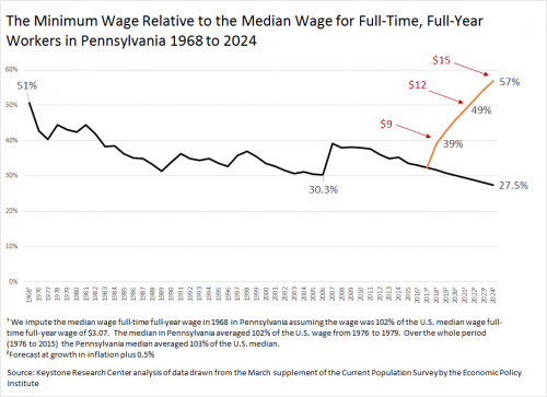 On Thursday we released the 22nd edition of the State of Working Pennsylvania in which we review the current state of the economy with an eye towards changes in the standard of living for working families in the commonwealth. One of the new pieces of information we present in this year’s report, with the help of the crack staff at the Economic Policy Institute, is the median wage for full-time full-year workers in Pennsylvania since 1968. In that year in Pennsylvania the typical worker had hourly earnings of $3.15 per hour, and the minimum wage was $1.60 per hour or 51% of the median wage. Flash forward to 2017 and we estimate the typical full-time full year worker took home $22.43 per hour while the minimum wage is $7.25 or 32% of the median.