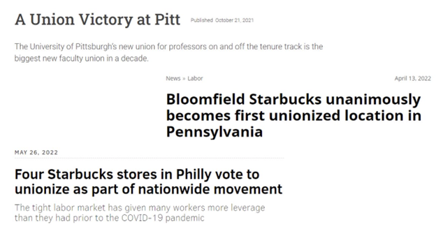 This blog focuses on labor unions. Polls show more support now for unions in America than since 1965. Unions also won more elections in the first half of 2022 than they have in 20 years, including headline-capturing victories at giant companies such as Starbucks and Amazon. Last year, in Pennsylvania, the United Steelworkers organized one of the anchor institutions of the Pittsburgh “eds and meds” economy, the University of Pittsburgh. To date, aggregate numbers on union membership do not show big trend increases—although union density in Pennsylvania stopped falling in the last decade. Even so, recent organizing successes foreshadow a possible union organizing wave like that in the 1930s. Union membership could grow quickly in locally rooted (“non-mobile”) service industries and in giant companies which, once unionized, want their competitors unionized also. There are no guarantees, of course, and whether the recent organizing wave becomes mass organizing or ebbs and decays depends partly on public policy and on whether elected officials support organizing from their “bully pulpit”—or join employers in an effort to coerce workers to not organize by threatening their jobs as they have repeatedly done in southern states such as Tennessee in recent decades.
