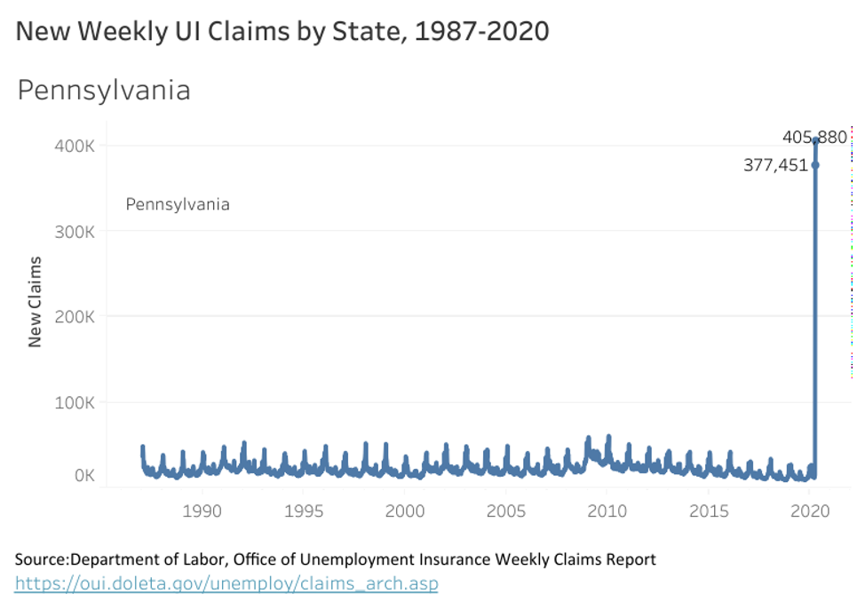 EPI’S cautious estimates are far from the most alarming. William Rodgers of The Century Foundation projects that the “true unemployment rate” in Pennsylvania is already 34.6%. (Pennsylvania’s March unemployment rate was only 6.0 percent but because workers were surveyed just before mid-month, this rate does not reflect conditions at the end of the month.) Rodgers estimate of unemployment was much higher because it took into consideration the off-the-chart spike in initial claims for unemployment seen nationally, and especially in Pennsylvania, in the last two full weeks of March (see chart.)