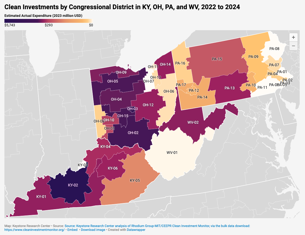 - Most congressional districts in the four-state region have benefited from clean energy investments between 2022-2024, ranging between $1 million and $5.7 billion.