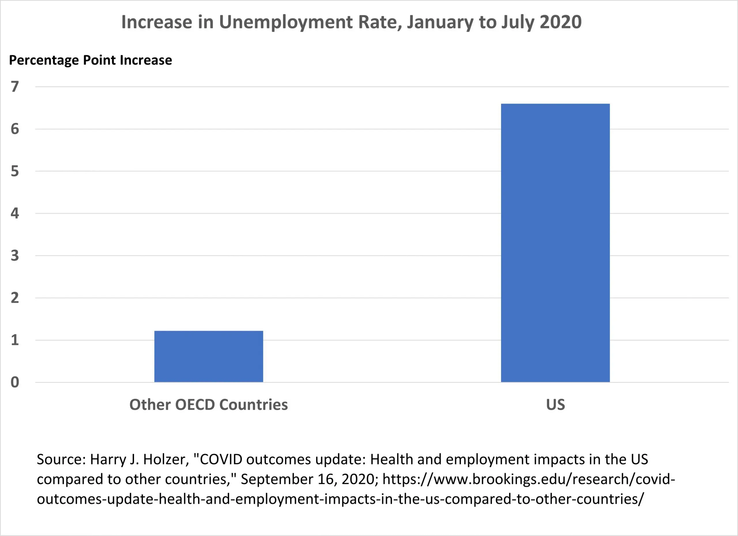 Turning now to joblessness, the U.S. unemployment rate rose 6.6 percentage points from January to July, more than five times as much as the 1.2 percentage point increase in other countries. The U.S. unemployment rate has dropped 2.3 percent since July. If there had been no improvement in other OECD countries since July, the U.S. would still have had a three-and-a-half times bigger increase in unemployment since January. (Holzer’s primary data source shows unemployment rates trending down shows slightly in other countries recently, but not as much as in the United States.)